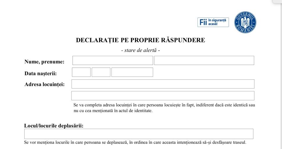 15 mai. Noul model - DECLARAȚIE pe PROPRIA RĂSPUNDERE în stare de alertă - DESCARCĂ AICI