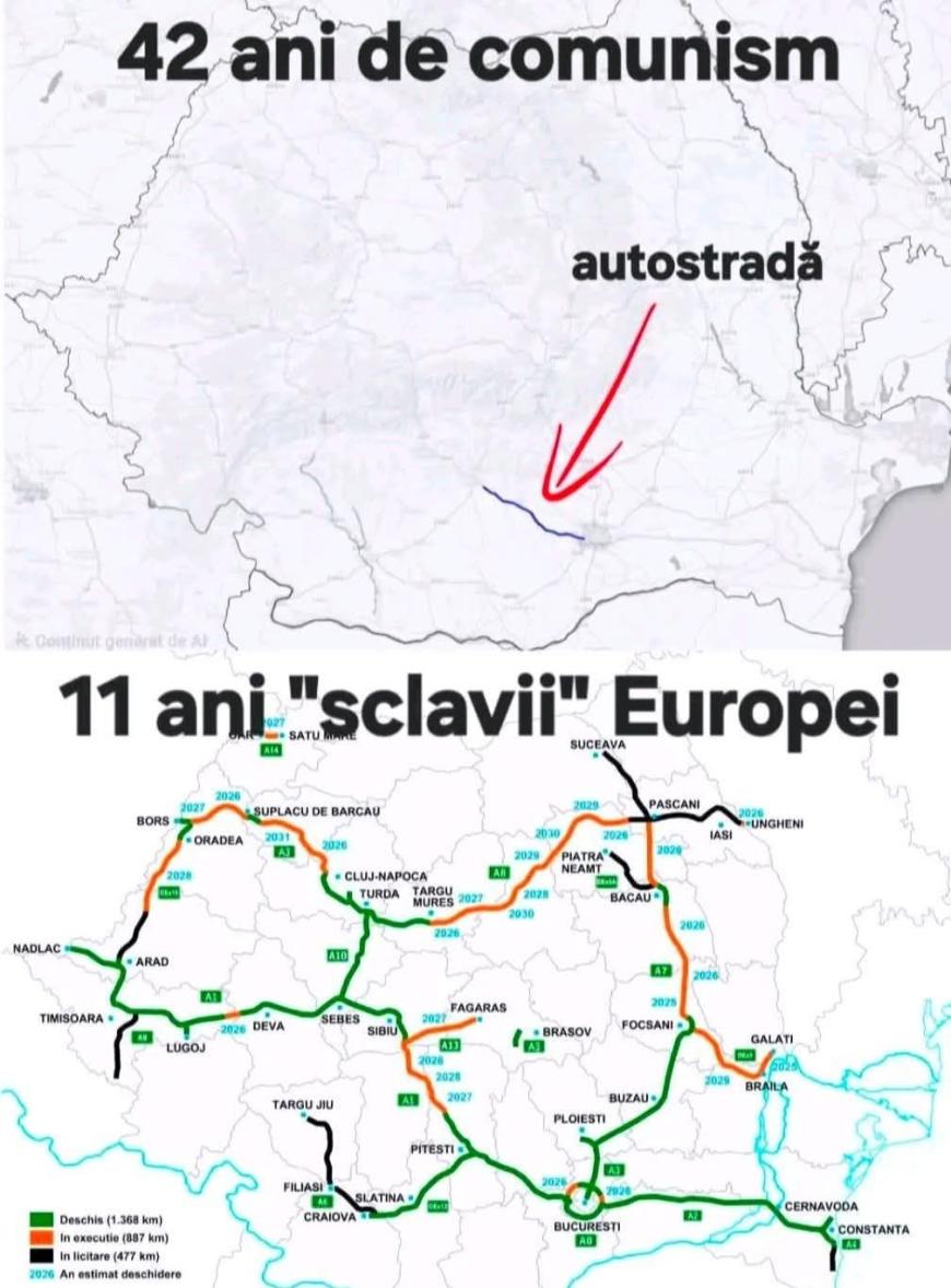 Privind hărțile una lângă alta, devine limpede că discuția despre „comunismul care a construit” și „Europa care ne ține sclavi” nu rezistă în fața realităților concrete. În patru decenii de regim centralizat, România a reușit să construiască bucăți de autostradă.