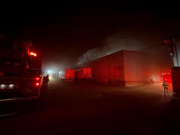 UPDATE: Hala are o lungime de aprox 260 de metri. În acest moment, arderea se manifestă cu intensitate ridicată în zona centrală, unde se acționează de la înălțime utilizând autoscările.