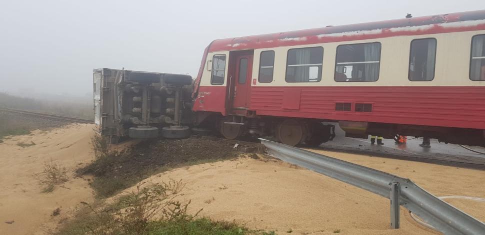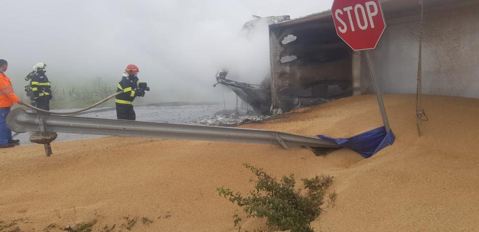 Accident feroviar grav în Timiș. Un TIR a luat foc și s-a răsturnat după ce a fost lovit de tren