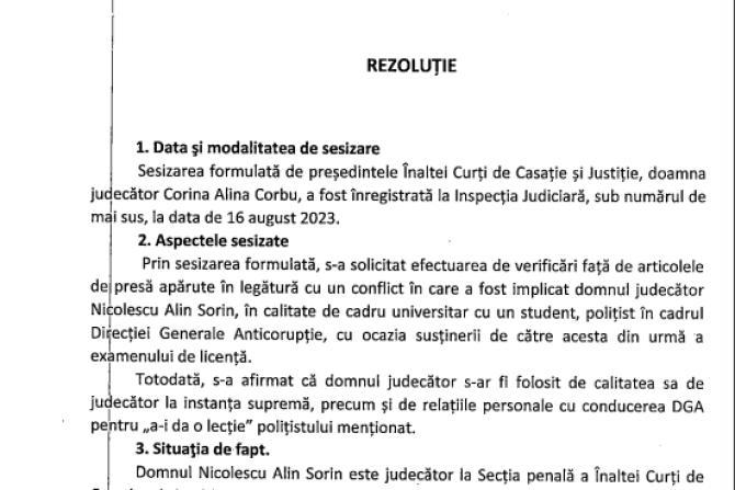 Acuzaţiile împotriva judecătorului Alin Nicolescu, de la ÎCCJ, declarate "nefondate" de Inspecţia Judiciară