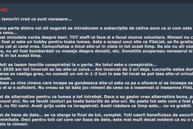 Administratorul Filelist transmite un nou mesaj, după ce a anunțat închiderea site-ului: Să lăsăm teoriile conspirației la o parte