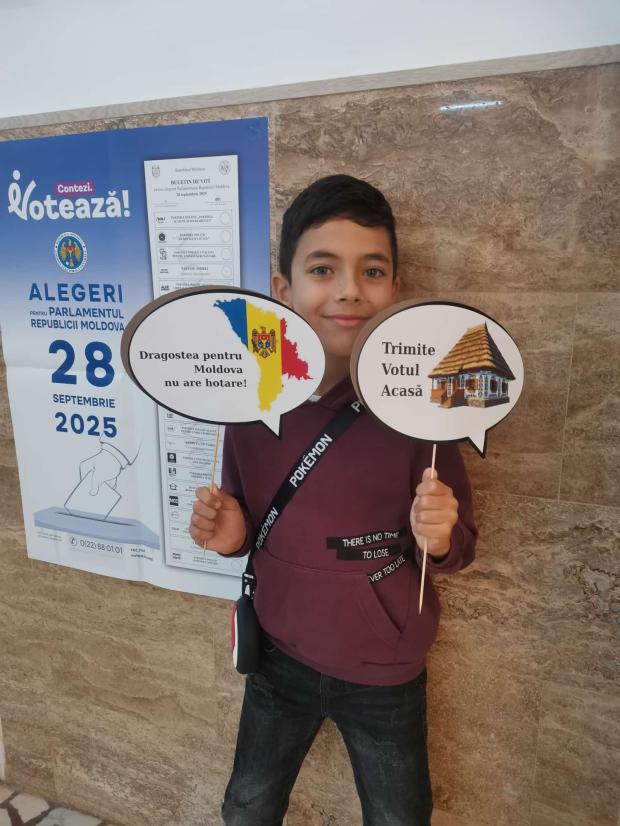 În interior, alegătorii se puteau fotografia cu panouri în formă de bulă de dialog, inscripționate cu mesaje motivaționale precum „Dragostea pentru Moldova nu are hotare” sau „Trimite votul Acasă!”.