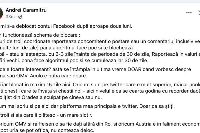 Andrei Caramitru a revenit pe Facebook după două luni în care a fost blocat: Asta se întâmplă DOAR când vorbesc despre Austria sau OMV