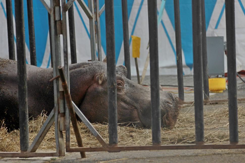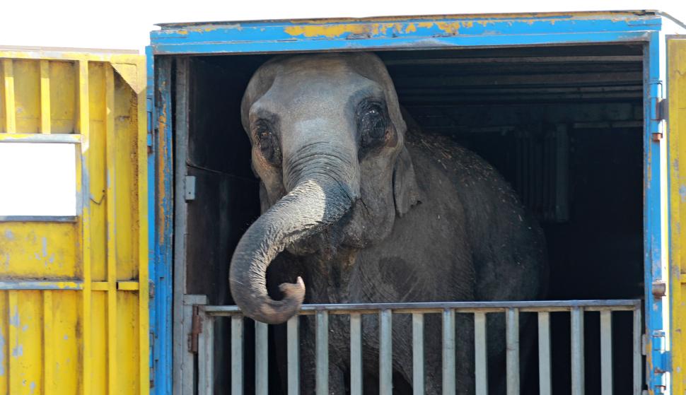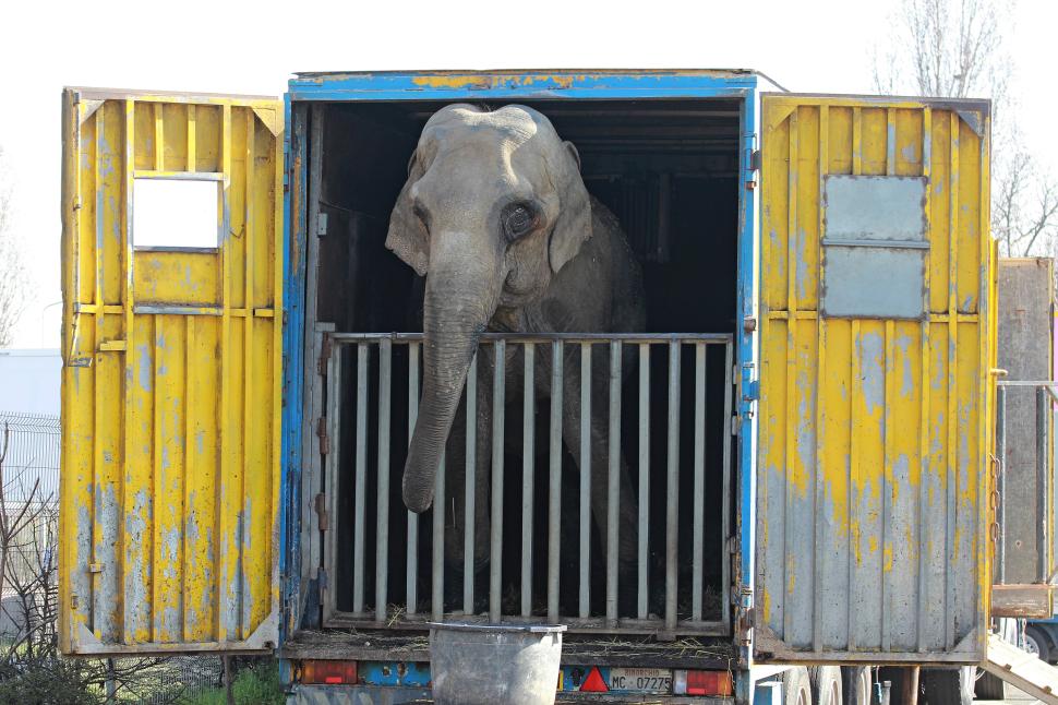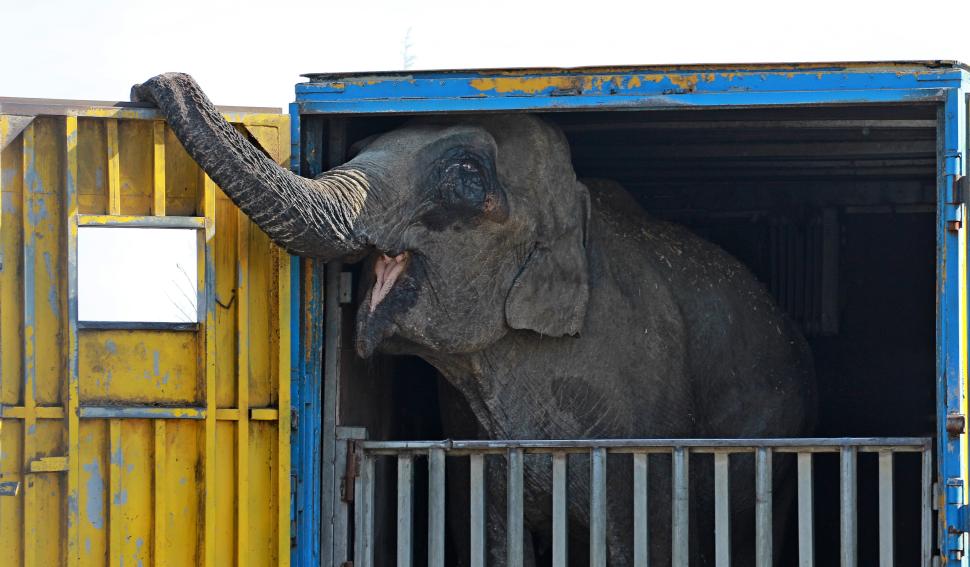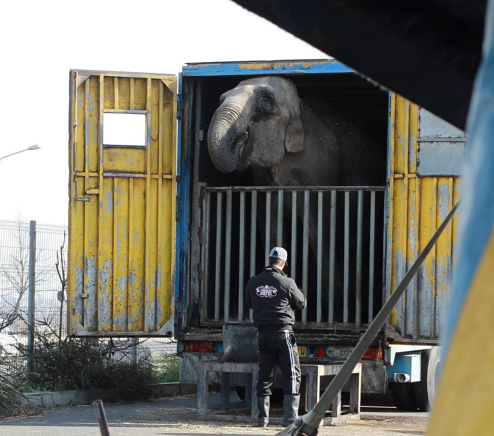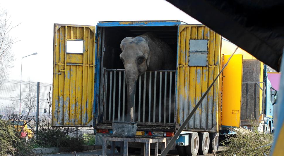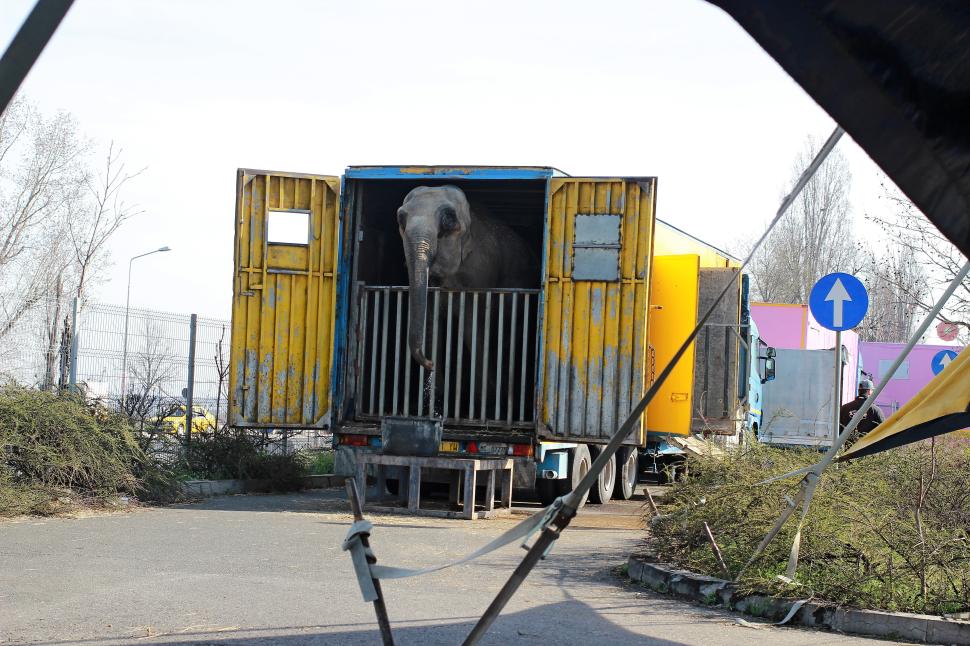 Animale de circ în stare deplorabilă, în parcarea unui hipermarket