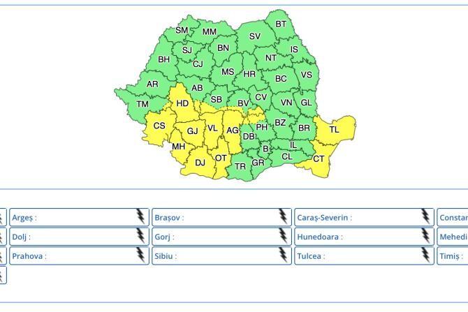 ANM, alertă meteo generală. A fost emis Cod Galben de averse torenţiale, descărcări electrice, intensificări ale vântului, izolat vijelii și grindină