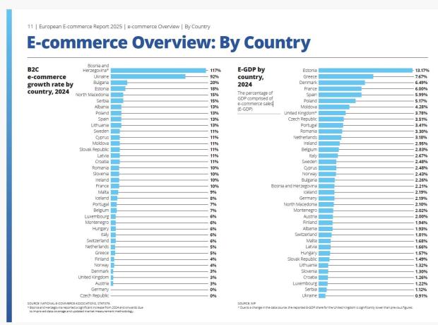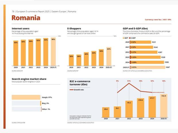 Comerțul electronic din România este așteptat să atingă 3,5% din PIB în 2025, consolidându-și poziția în Top 10 state membre UE ca E-GDP, potrivit European E-Commerce Report 2025.
