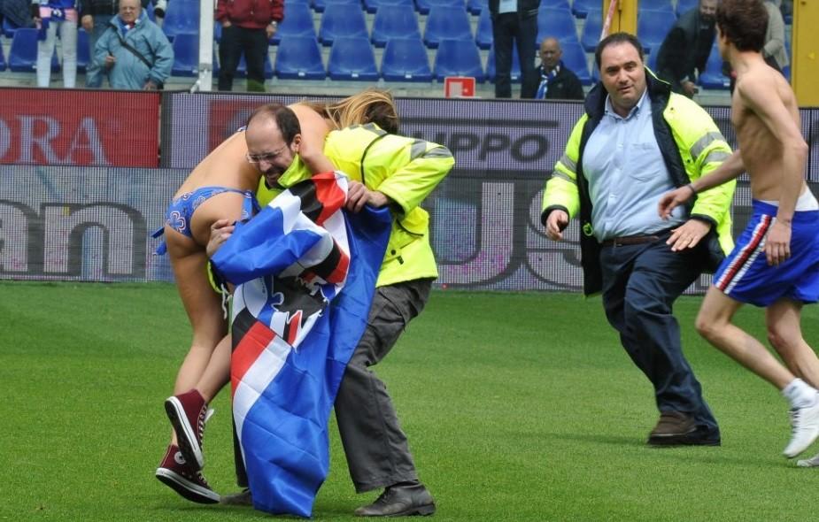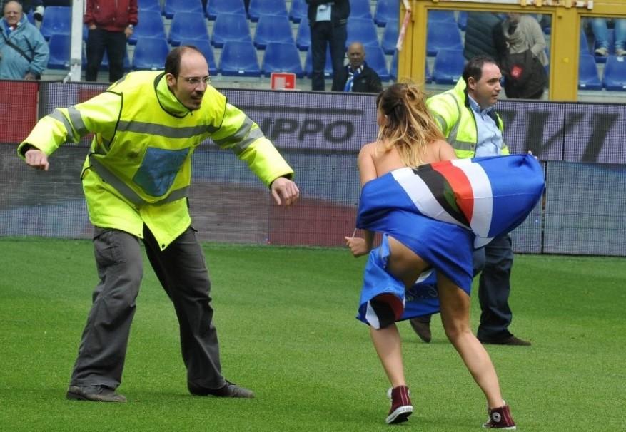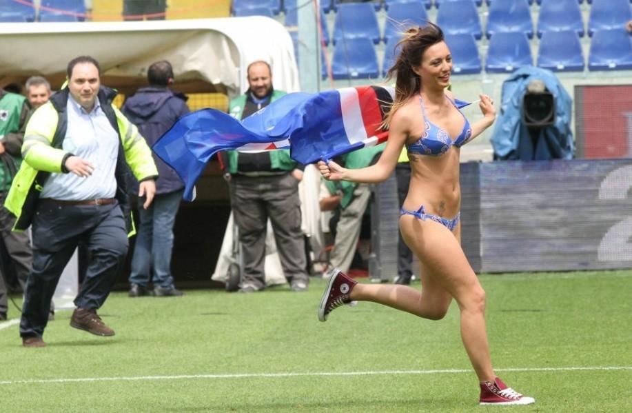 Atât de sexy că s-a întrerupt meciul. O fană a intrat în bikini pe teren!