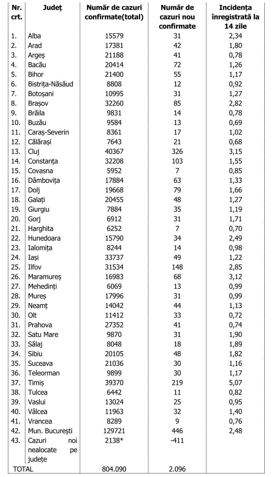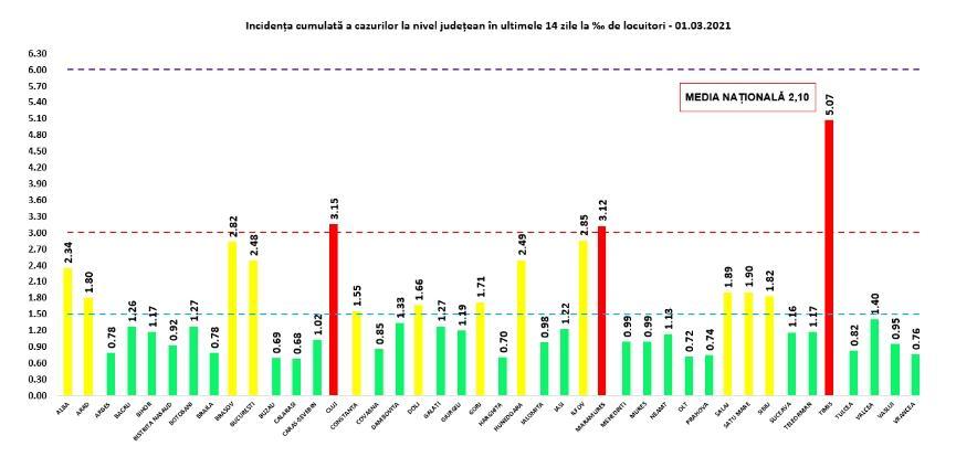 Bilanț COVID-19, 1 martie 2021. Raport de infectare pe JUDEȚE: Clujul, din nou, în scenariul ROȘU