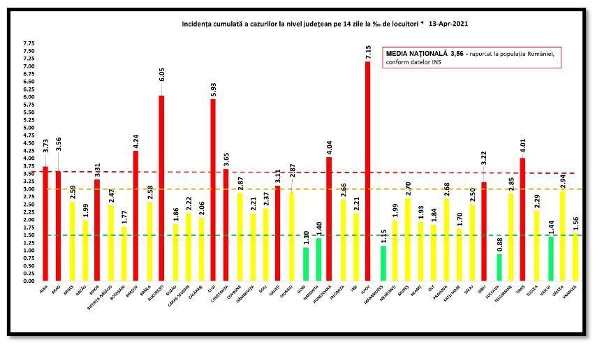 Bilanț COVID-19, 13 aprilie 2021. Raport de infectare pe JUDEȚE