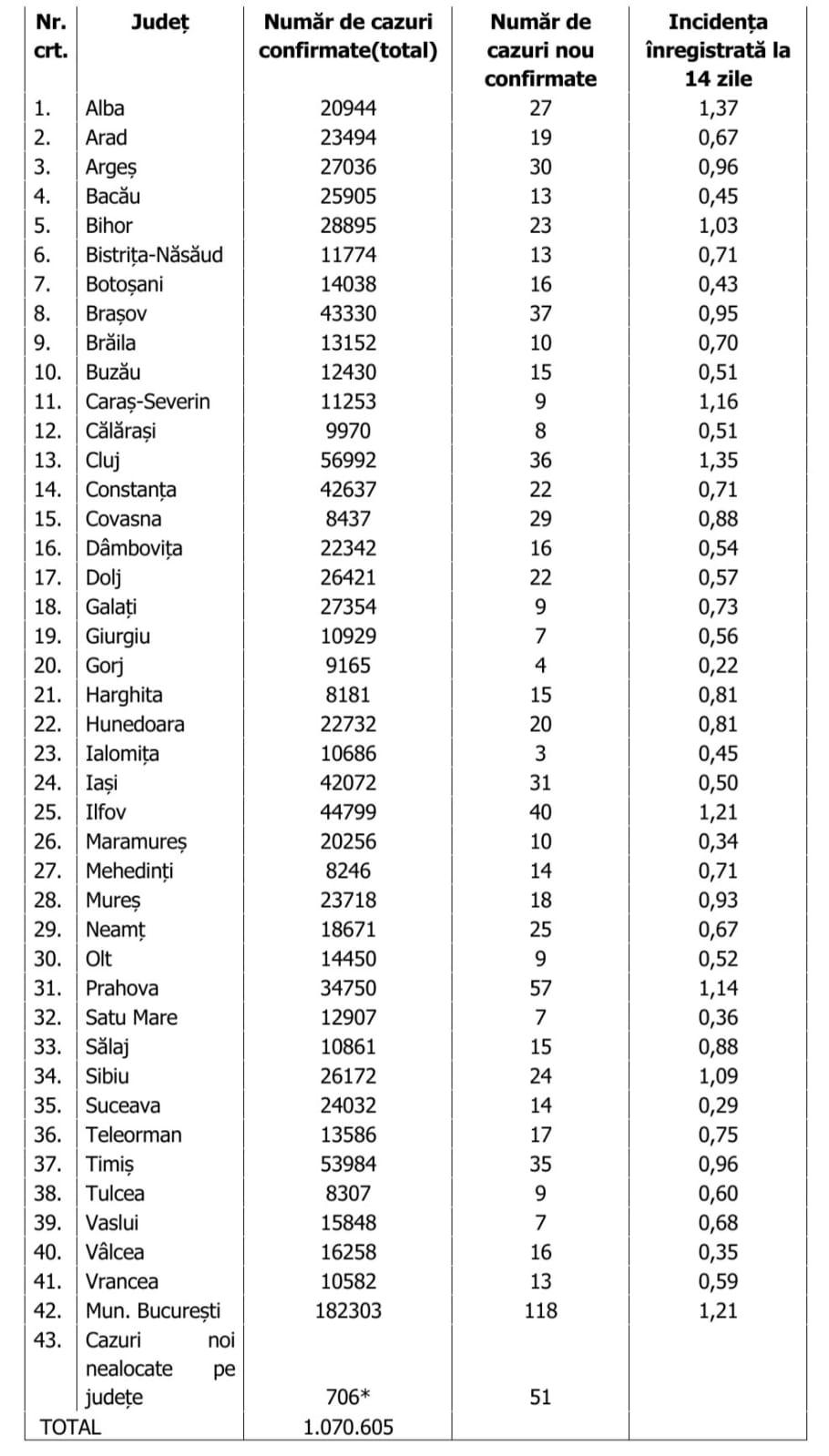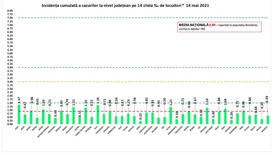 Bilanț COVID-19, 14 mai 2021. Raport de infectare pe JUDEȚE