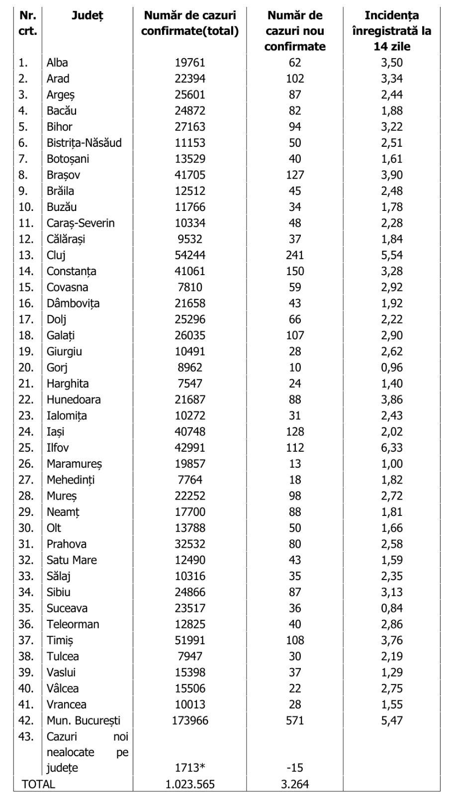 Bilanț COVID-19, 16 aprilie 2021. Raport de infectare pe JUDEȚE