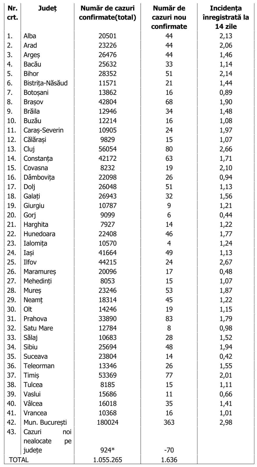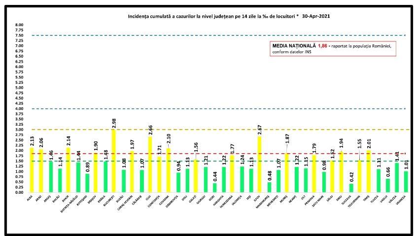 Bilanț COVID-19, 30 aprilie 2021. Raport de infectare pe JUDEȚE