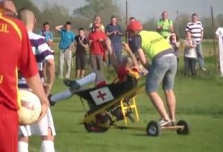 Cascadorii râsului: Fotbalist scos cu roaba din teren - Video