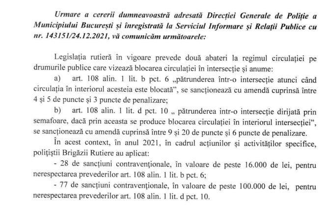 Câte amenzi s-au dat pentru blocarea circulației în intersecții, în București, în 2021. Răspuns oficial pentru DCNews