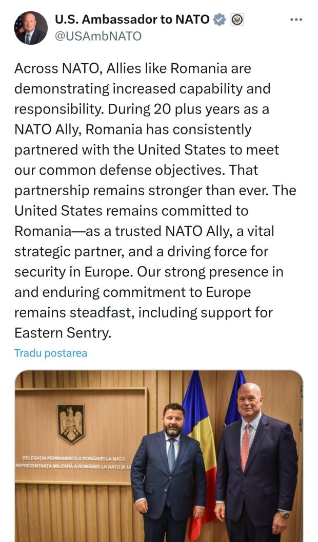Acest parteneriat rămâne mai puternic ca niciodată. Statele Unite își mențin angajamentul față de România - ca aliat NATO de încredere, partener strategic vital și forță motrice pentru securitatea în Europa. Prezența noastră puternică și angajamentul nostru de durată față de Europa rămân neclintite, inclusiv sprijinul pentru misiunea Eastern Sentry", a scris ambasadorul SUA la NATO pe pagina sa de de X.