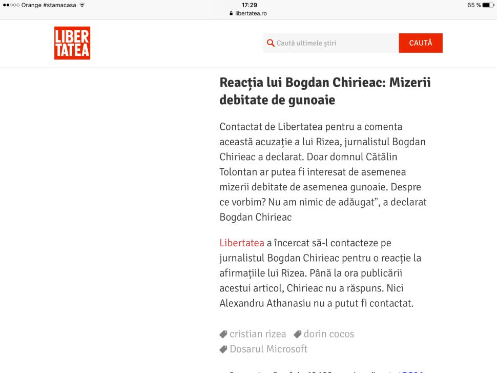 Chirieac: Doar domnul Tolontan ar putea fi interesat de asemenea mizerii, debitate de asemenea gunoaie
