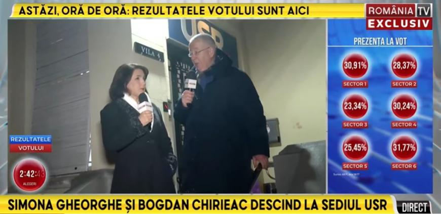 „Acum că am aflat unde este sediul USR, o să vă rog să veniţi cu mine că aş vrea să depun o cerere de adeziune”, i-a spus, în stilul său caracteristic, Bogdan Chirieac Simonei Gheorghe pe scările sediului USR, la plecarea spre următorul sediu de campanie. Desigur, știți deja gluma lui Chirieac pe care o folosește la Miercurea Neagră când interpretează rolul USR-istului la emisiune.