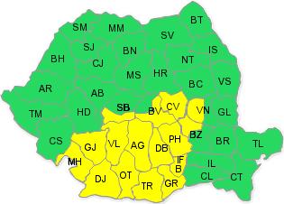 Cod galben de ploi abundente și vânt puternic. Local se va produce brumă