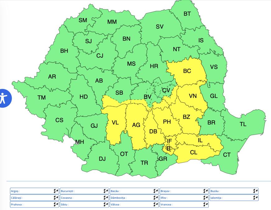 În același timp, a fost emis Cod Galben de ploi însemnate cantitativ. ”În județele Vâlcea, Argeș, Dâmbovița, Prahova, Buzău, Vrancea, Bacău, Călărași, Ialomița, Ilfov și municipiul București, dar și în zona de munte a județelor Sibiu, Brașov și Covasna, va ploua însemnat cantitativ și se vor acumula 20...30 l/mp și izolat peste 50 l/mp” anunță ANM.
