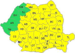 COD GALBEN de ploi torenţiale, vijelii şi grindină în 36 de judeţe şi Bucureşti