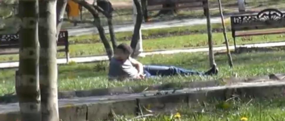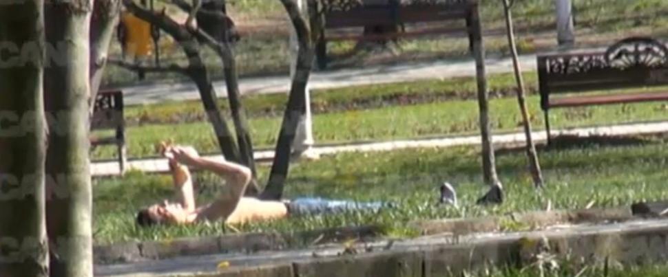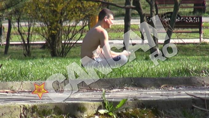Cristian Boureanu, la bustul gol, într-un parc din Capitală