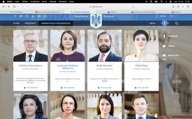 Pe pagina dedicată consilierilor prezidențiali figurează în continuare nume care, potrivit informațiilor publice, nu mai fac parte din actuala echipă a Palatului Cotroceni.