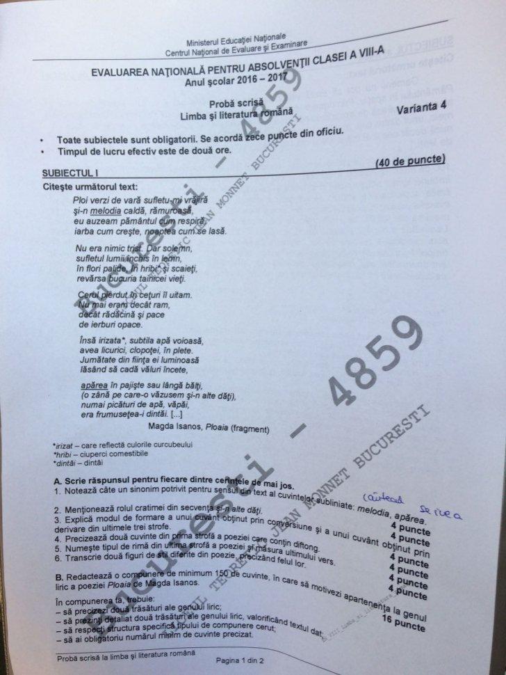 EVALUARE NAȚIONALĂ 2017. SUBIECTE ROMÂNĂ și BAREME
