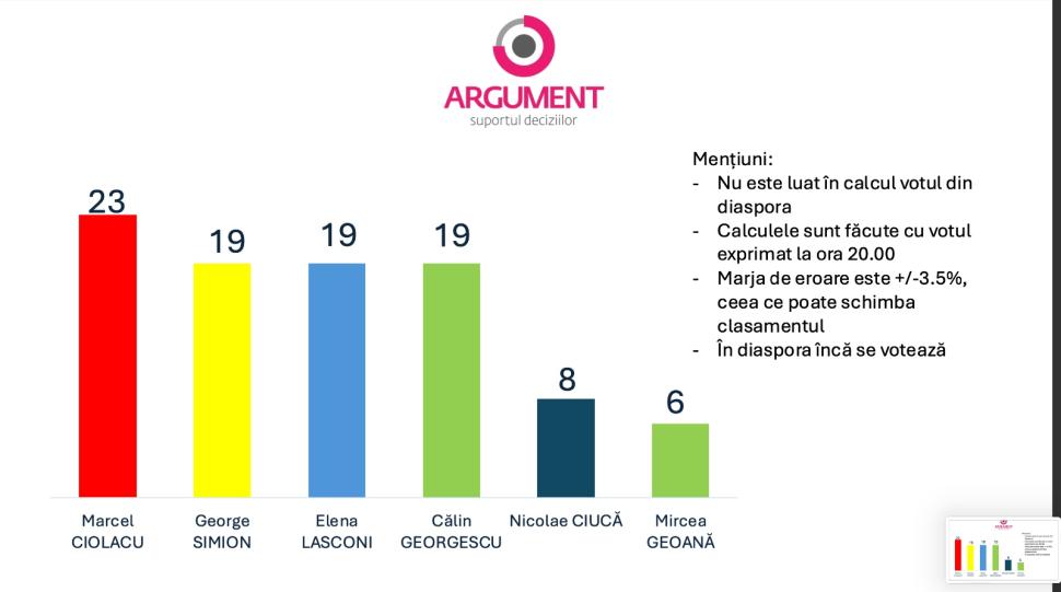 EXIT - POLL ARGUMENT, primele rezultate vot prezidențiale, tur I: Procentele momentului, la ora 21:00
