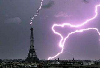 Fenomen rar la Paris. Turnul Eiffel, lovit de 3 fulgere