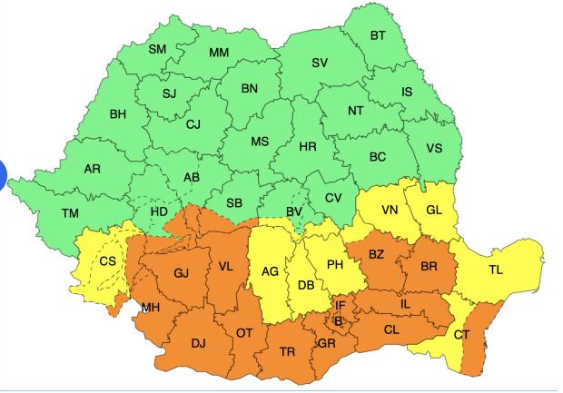 Cod Portocaliu, din 2 octombrie (ora 20:00) până în 3 octombrie (ora 10.00), de vânt puternic în Teleorman, Giurgiu, Călărași, Ialomița, Brăila, Buzău, Ilfov, municipiul București și în zona de litoral a județului Constanța. Vântul va avea intensificări puternice și susținute cu rafale de 70 - 85 km/h.
