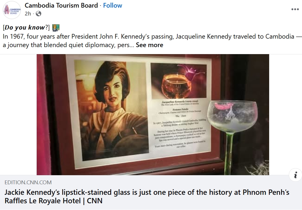 Când hotelul a fost cumpărat de grupul Raffles în anul 1996, un angajat ar fi descoperit chiar paharul din care Jacqueline Kennedy a băut cocktailul. Paharul a fost recunoscut după urma de ruj rămasă pe margine. Astfel, l-a salvat în timpul lucrărilor de renovare. Astăzi, acel pahar, alături de câteva poze din călătoria fostei Prime Doamne la Phnom Penh, sunt expuse într-o vitrină din fața Elephant Bar.
