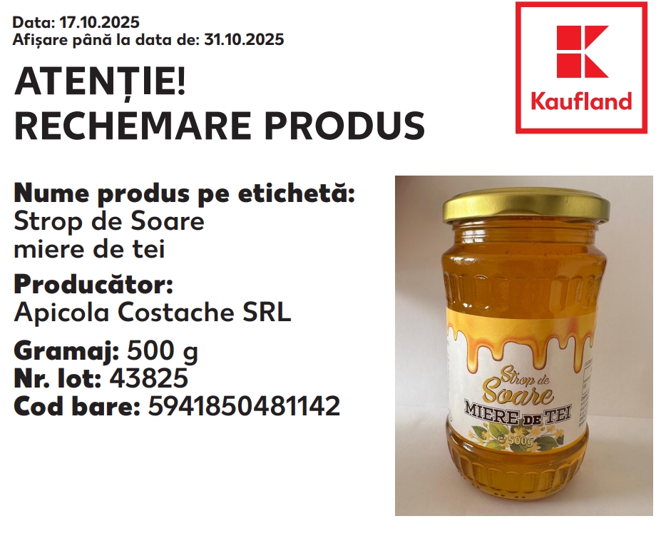 Kaufland a anunțat că operatorul economic Ciril Shop & Go SRL a retras de la vânzare produsul Strop de Soare miere de tei 500 g cu număr de lot 43825, și cu termenul de valabilitate: 15.09.2027.
