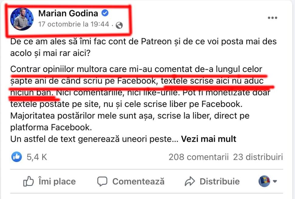Godină cere bani să-l citești, supărat că postările lui se transformă în știri fără să câștige nimic. Patrick André de Hillerin: Ce este cu banii ăia de la Facebook din declarația de avere?