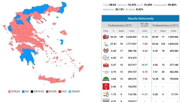GRECIA, REZULTATE OFICIALE PARȚIALE ALEGERI. SYRIZA: 36,13%. NOUA DEMOCRAȚIE: 27,81%
