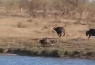 Impresionant! Părinţii unui pui de bivol capturat de lei se întorc cu toată turma să-l salveze