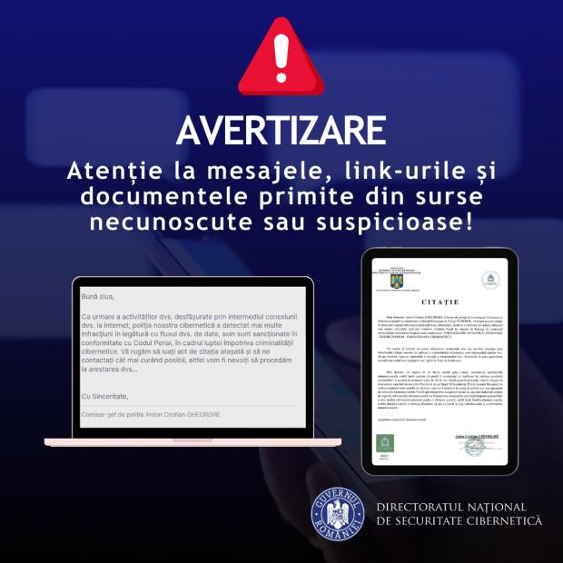 "Atenție la mesajele, link-urile și documentele primite din surse necunoscute sau suspecte!