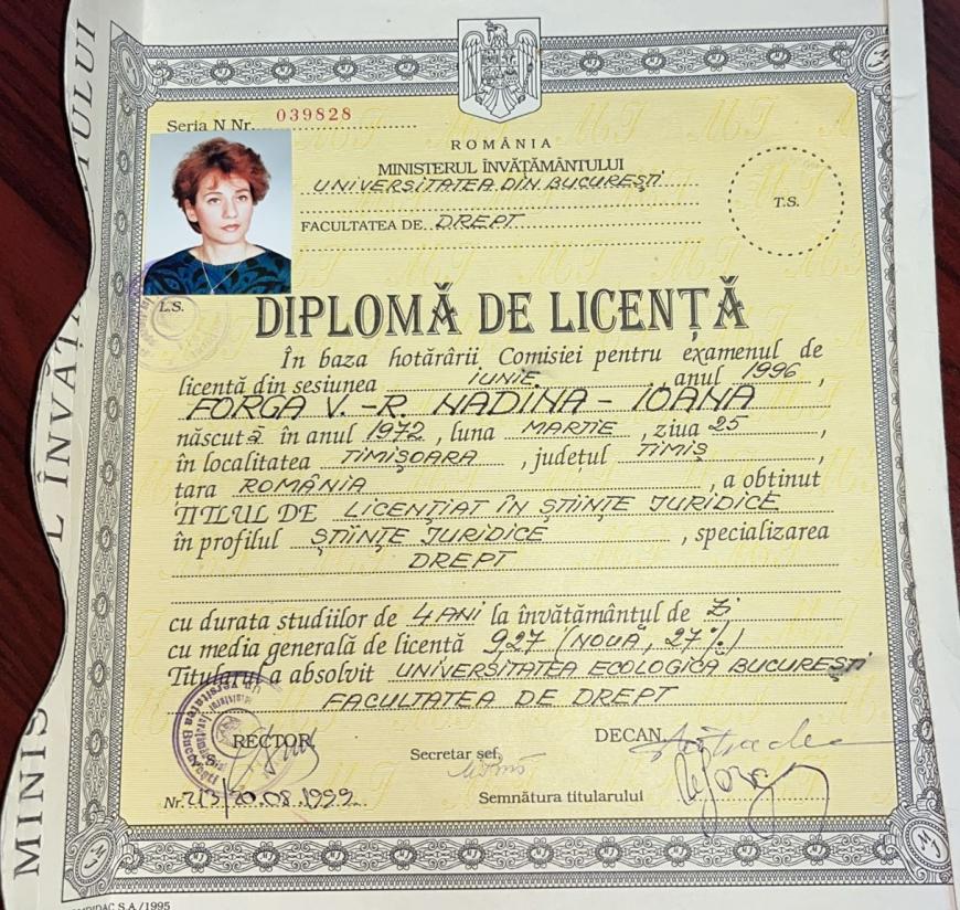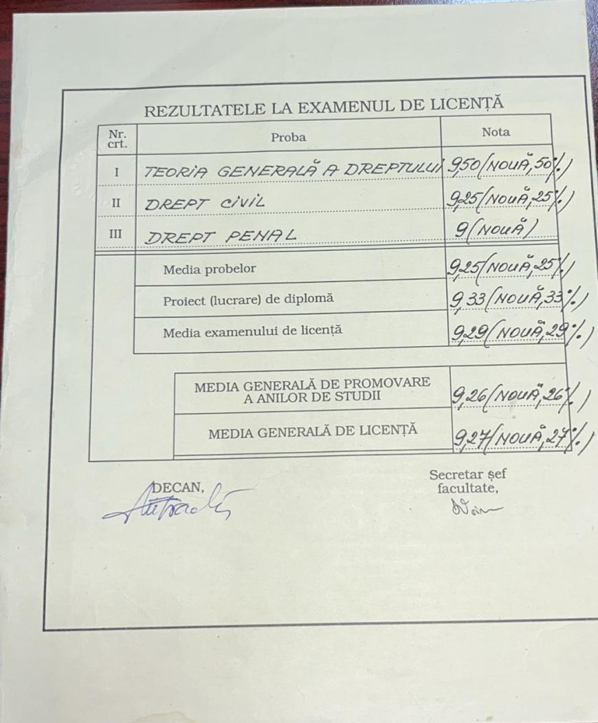 Diploma arată finalizarea studiilor în profilul Științe Juridice - Drept, cu o medie generală a licenței de 9,27. Anexa aferentă examenului de licență include notele la probele susținute: Teoria Generală a Dreptului, Drept Civil și Drept Penal, cu medii situate între 9 și 9,50.