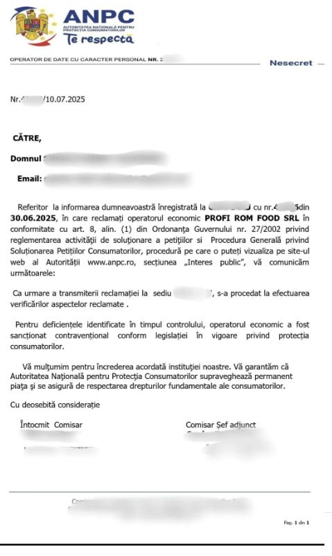 Alți participanți la discuție au adus exemple în care ANPC a intervenit eficient: „Permite-mi să te contrazic. Am fost cu un prieten în cartier la un Profi să cumpărăm două doze de suc. Am ajuns la casă, am plătit și din prostie m-am uitat pe spate: o doză era bună, cealaltă era expirată. Am zis aia e, se mai întâmplă, așa că i-am zis vânzătoarei și m-am dus la frigider să iau alta. Mă uit pe spate, expirată. Am mai luat încă vreo trei, erau la fel. Am făcut poză la bon, la doze, am trimis către ANPC și am primit răspunsul din imagine. Și nu e singura reclamație pe care o fac”.