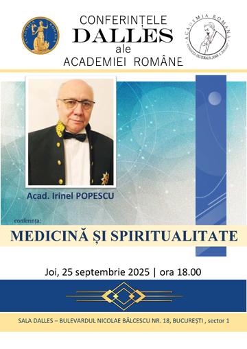 Joi, 25 septembrie 2025, de la ora 18.00, Sala Dalles din București (Bd. Nicolae Bălcescu nr. 18, sector 1) va găzdui conferința „Medicină și spiritualitate”, susținută de academicianul Irinel Popescu.