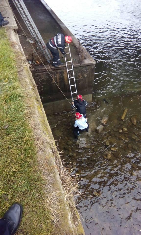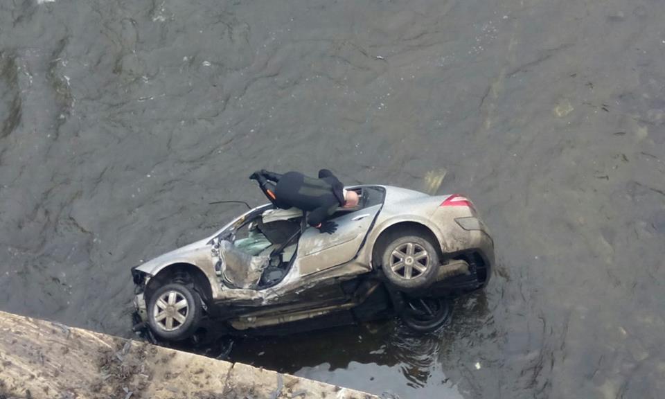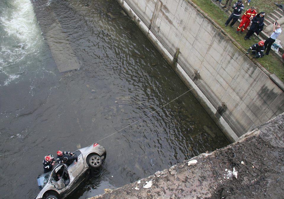 Mașină căzută în Dâmbovița. Operațiune dificilă de salvare-FOTO