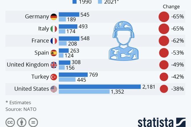 NATO și-a redus masiv trupele în ultimii 32 de ani. Armatele din Germania și Italia s-au micșorat cu 65%