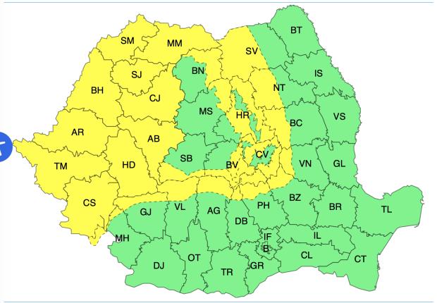 În același timp, ANM a emis alertă de Cod Galben de vânt puternic, de astăzi, de la ora 12:00, până în 18 noiembrie, la ora 06:00, valabil pentru Banat, Crișana, vestul Transilvaniei, Maramureș și zona montană: „Vântul va avea temporar intensificări, la început în Banat și Crișana, iar spre seară și noaptea și în vestul Transilvaniei și Maramureș, cu viteze de 50...60 km/h și izolat de 70 km/h. În zonele montane vor fi intensificări ale vântului cu viteze de 70...90 km/h, iar la altitudini de peste 1700 m vor fi rafale de 90...120 km/h”.