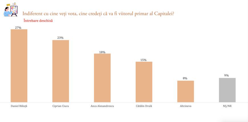Indiferent cu cine votează, bucureștenii cred tot pe Daniel Băluță că va câștiga alegerile. La întrebarea deschisă privind potențialul viitor primar, 27% l-au indicat pe Băluță, urmat de Ciucu cu 23% și Alexandrescu cu 18%.