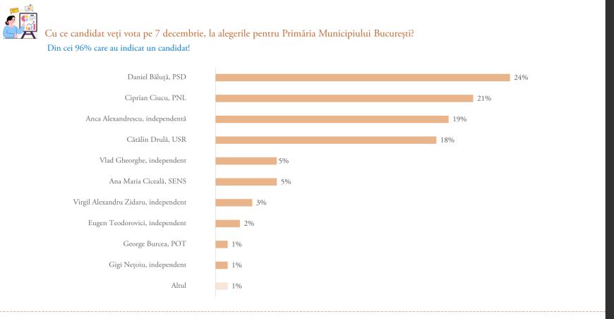 Sondajul a fost comandat de Vlad Gheorghe, candidat independent la Primăria București. Conform datelor din sondaj, Daniel Băluță (PSD) se situează pe primul loc cu 24% din voturile celor care au indicat un candidat. Urmează Ciprian Ciucu (PNL) cu 21%, Anca Alexandrescu (independent) cu 19% și Cătălin Drulă (USR) cu 18%.