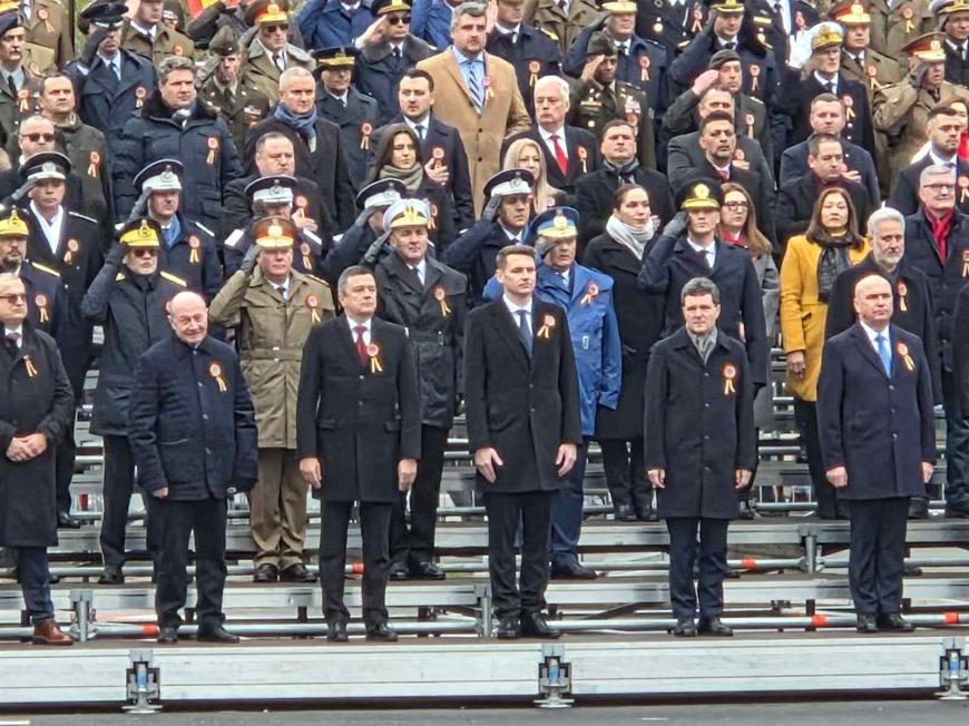 Personalități politice și reprezentanți militari la parada militară de 1 Decembrie 2025, Arcul de Triumf, București. De la stânga la dreapta: Fostul președinte al României, Traian Băsescu; Președintele Camerei Deputaților, Sorin Grindeanu; Președintele Senatului, Mircea Abrudean; Președintele României, Nicușor Dan; Premierul României, Ilie Bolojan. Sursa foto: DCNews/ Florin Răvdan