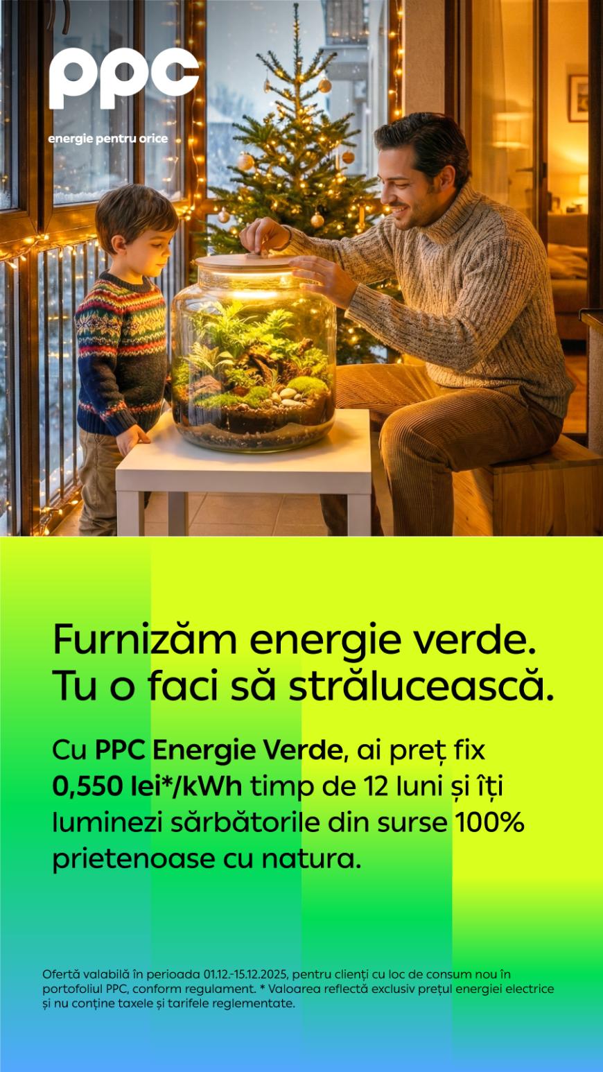 PPC Energie, furnizorul integrat de energie, vine cu o nouă ofertă înainte de sărbători pentru PPC Energie Verde, un produs cu energie provenită din surse 100% regenerabile și preț fix al energiei active de 0,550 lei/kWh pentru contractele semnate în perioada 01 - 15 decembrie 2025.