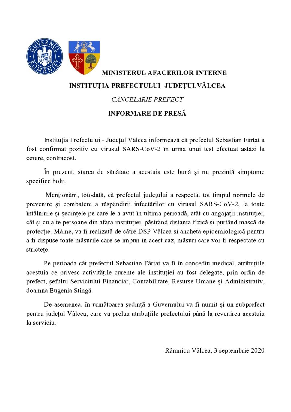 Prefectul județului Vâlcea, confirmat pozitiv cu COVID-19