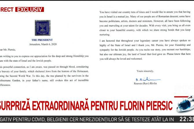 Președintele Israelului, scrisoare pentru Florin Piersic, cu ocazia celor 85 de ani împliniți