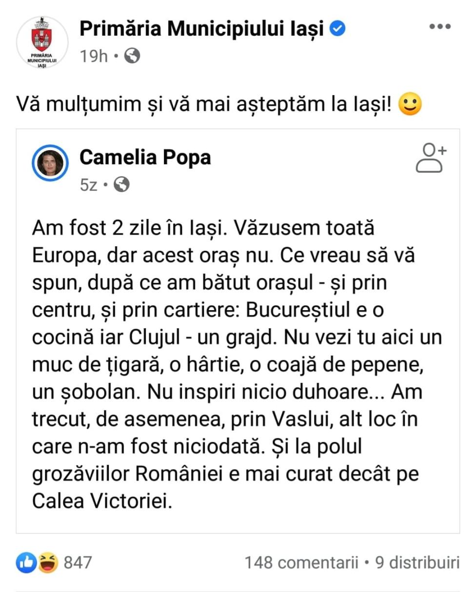 Primăria Iași îi mulțumește pe Facebook unei turiste care a spus că Bucureștiul e o cocină, iar Clujul un grajd